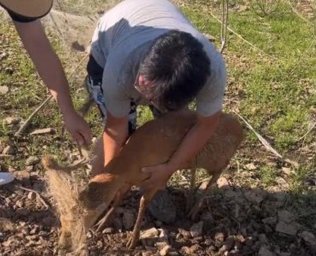 救狍子要紧,狍子使劲挣脱,人就使劲抱住它,其他人就赶紧一根一根剪断绳子。李女士说,大概两三分钟,绳子就全剪断了。