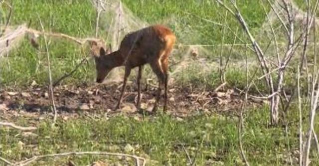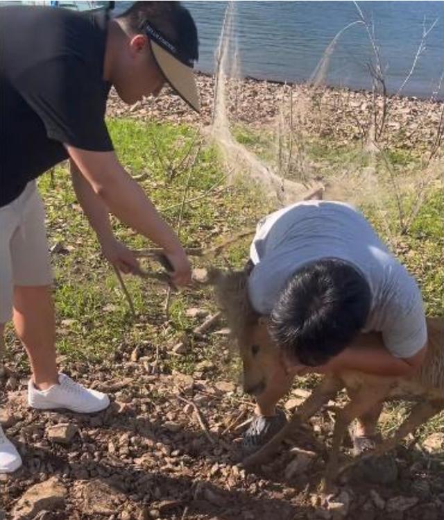 下午的时候,他们正在河边休息,隐约看到河对岸有东西在动,用手机镜头拉近一看,竟然是一只“傻狍子”被困在绳网里了,在那使劲挣扎呢。