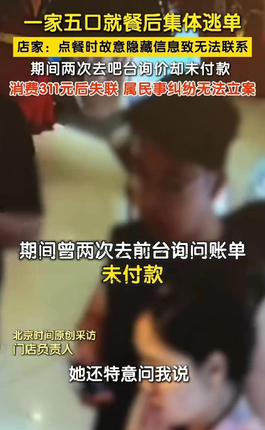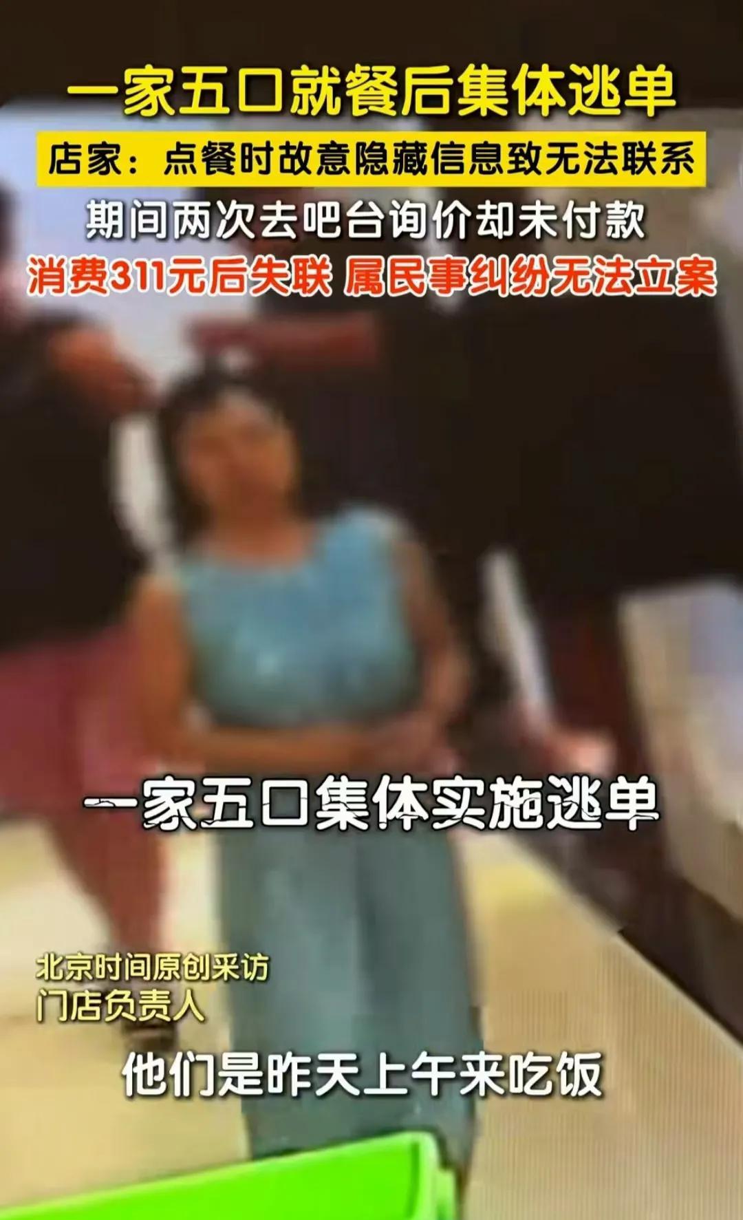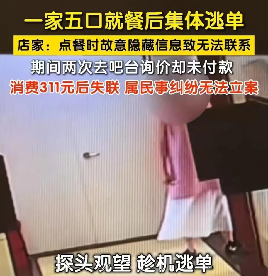 一家五口在餐厅消费311元,结果却集体逃单,而且还成功了。但最后怎么可能成功,这一家五口在想什么呢,且不说五个人消费311元,也不算天价宰客,而且这五个人看穿着打扮,家庭经济条件也不算太差,为什么会选择逃单这个“绝路”呢?我为什么说集体逃单是绝路呢,就算你隐藏了手机上的所有信,你们也应该知道,所有的商家都是装了监控的啊,走出商家到城市的每个角落每个角落都有监控,天网之下你怎么可能逃得了,除非遁地行走。更关键的是,如果商家没有打码,把你们的视频都全网传播,这真的太丢人了。何必为了这么300多块钱,亏心一辈子呢。#旅游# #饭店消费# #餐饮店逃单#