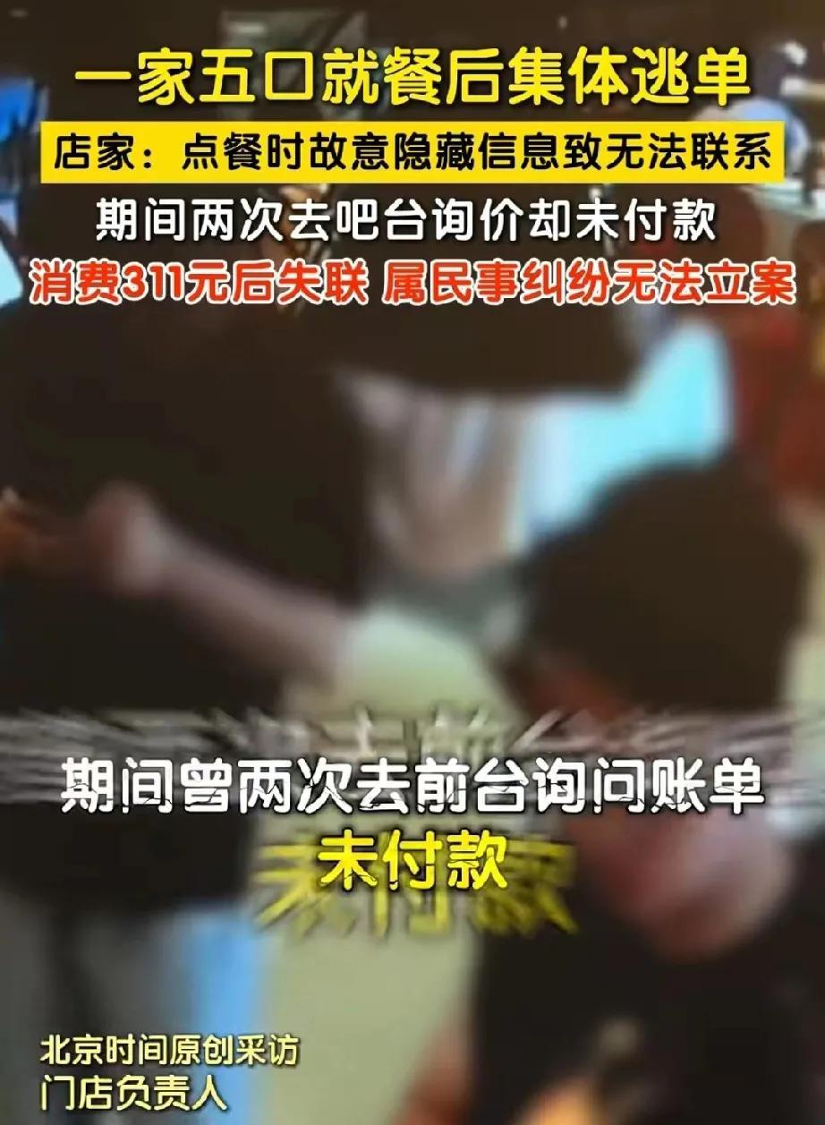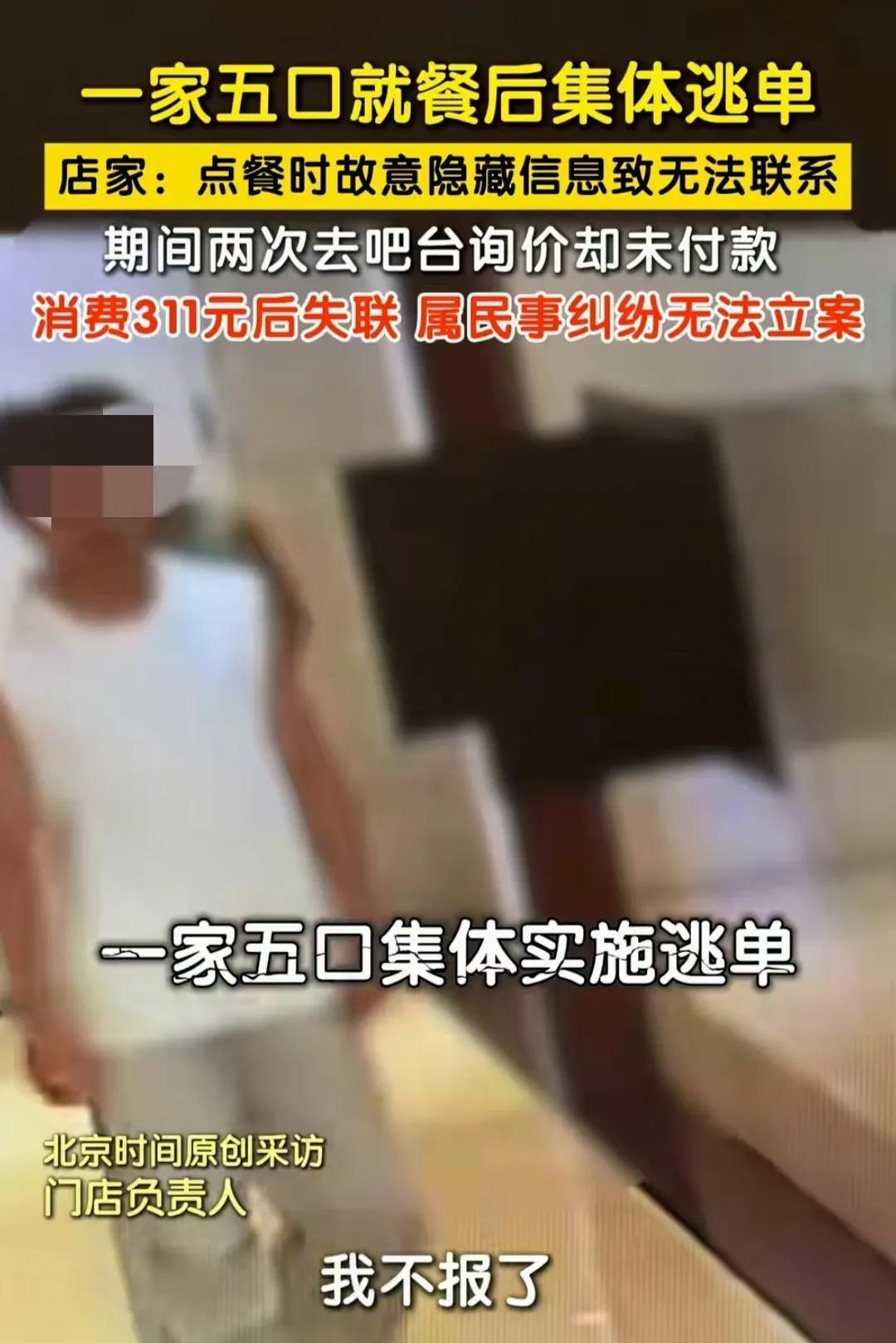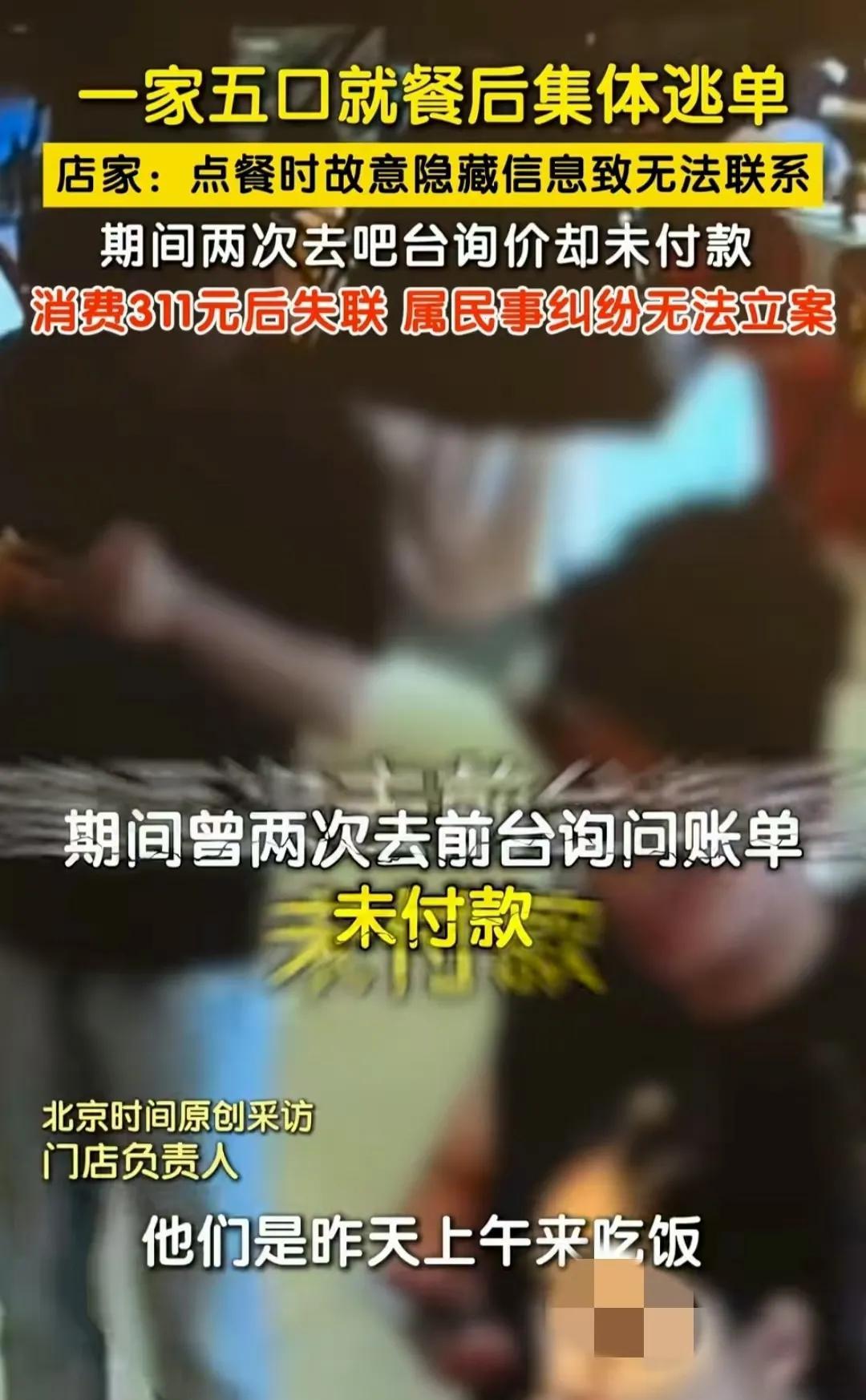一家五口在餐厅消费311元,结果却集体逃单,而且还成功了。但最后怎么可能成功,这一家五口在想什么呢,且不说五个人消费311元,也不算天价宰客,而且这五个人看穿着打扮,家庭经济条件也不算太差,为什么会选择逃单这个“绝路”呢?我为什么说集体逃单是绝路呢,就算你隐藏了手机上的所有信,你们也应该知道,所有的商家都是装了监控的啊,走出商家到城市的每个角落每个角落都有监控,天网之下你怎么可能逃得了,除非遁地行走。更关键的是,如果商家没有打码,把你们的视频都全网传播,这真的太丢人了。何必为了这么300多块钱,亏心一辈子呢。#旅游# #饭店消费# #餐饮店逃单#