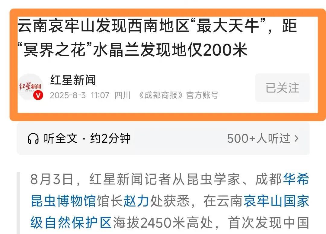 科学家在云南哀牢山区发现西南地区最大天牛威氏王天牛,说其体长最长可达80毫米。我个人觉得昆虫学家恐怕没见过世面吧,我小时候生活在四川,经常看到天牛,有些天牛真的很大很长,感觉不止80毫米。现在昆虫学家说这是西南地区最大的天牛,有经过严格的科学论证吗,还是查阅了所有的资料。不能动不动就说最大最长最高。(图片信息源自红星新闻)