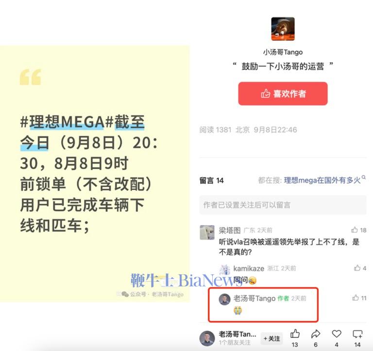 值得注意的是,9月8日,理想汽车产品线负责人“老汤哥Tango”在公众号评论“听说vla召唤被遥遥领先举报了上不了线,是不是真的?”下回复了一个哭泣的表情。