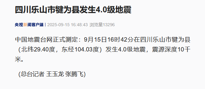 中国地震台网正式测定:9月15日16时42分在四川乐山市犍为县(北纬29.40度,东经104.03度)发生4.0级地震,震源深度10千米。(总台记者王玉龙张腾飞)