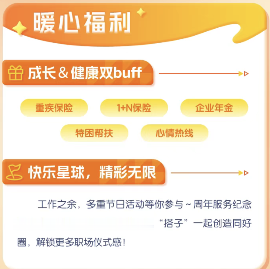 南京银行就提出了,为员工安排了“鑫福家”健康福利生态体系,具体包括生活保障、健康守护、关爱津贴、学习培训、带薪休假、服务配套等安排,其中不仅有常规五险一金,还有住房补贴、企业年金、补充医疗保险、终身健康保障、子女综合医疗保障、境外培训项目、文体娱乐和社团活动等