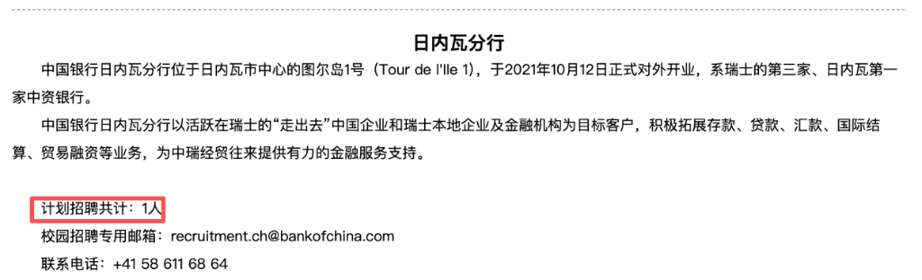 当然,其中部分岗位招录人数有限,比如,中国银行日内瓦分行就招聘1名,这对于有志于在境外工作的应届生,可能要仔细权衡。