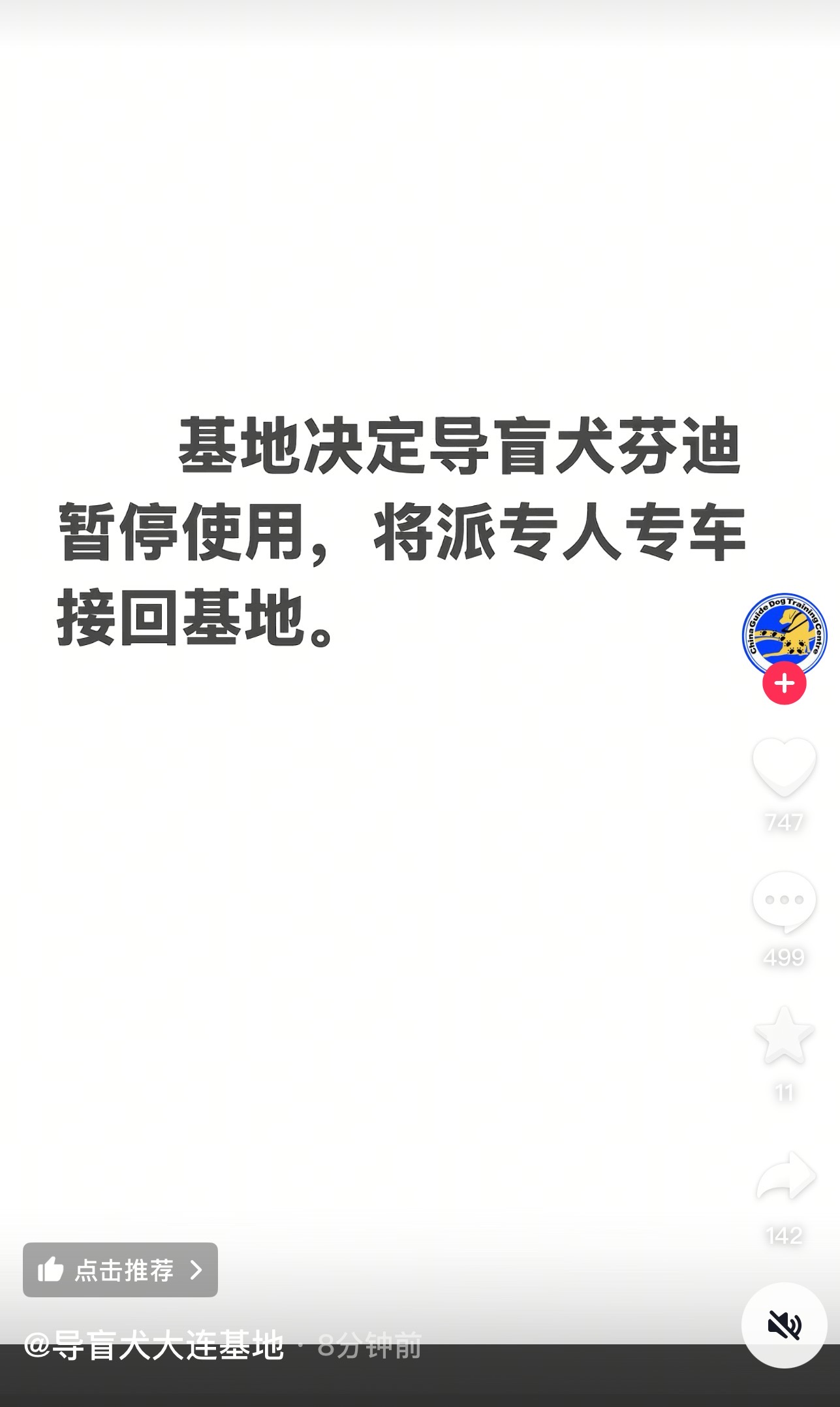 9月18日上午10点,大皖新闻记者注意到,中国导盲犬大连培训基地官方抖音账号就此事作出回应:“基地决定导盲犬芬迪暂停使用,将派专人专车接回基地。”