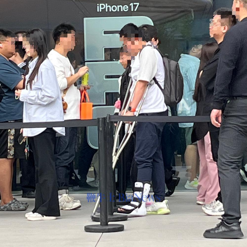 不得不说,大哥才是真果粉,“咱都拄着拐了,还不忘来抢手机”。