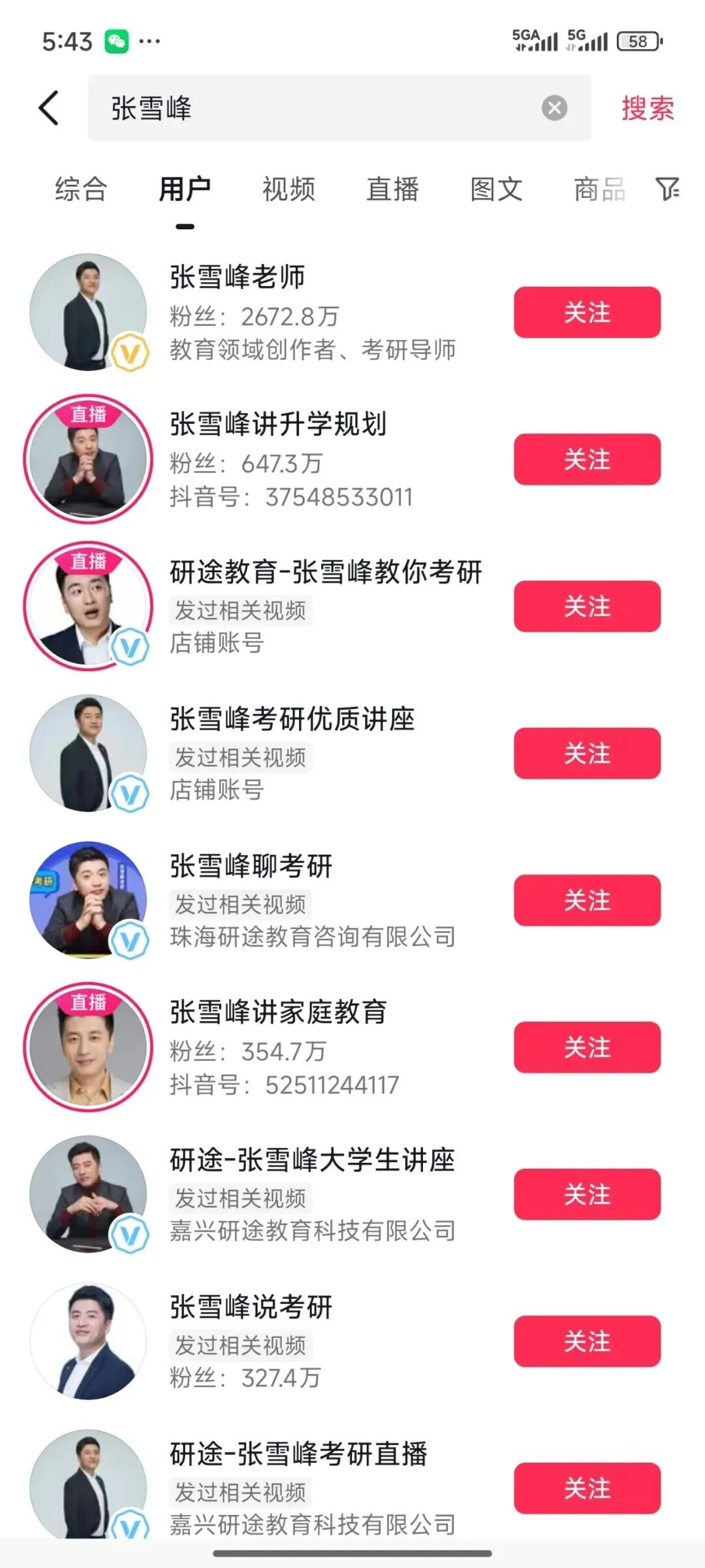 9月24日,有媒体发现张雪峰账号在微博、小红书、抖音和B站平台均被禁止关注。但在抖音平台上如“张雪峰讲升学规划”、“张雪峰聊考研”、“张雪峰说考研”等账号目前依然可以关注,且多个账号正在直播。