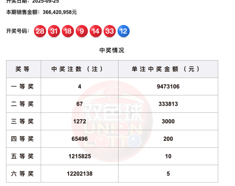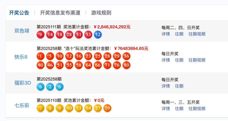 大皖新闻讯9月25日晚,中国福彩网更新彩票开奖公告。双色球、快乐8、福彩3D等玩法最新中奖号码出炉。其中,双色球第2025111期中奖号码为2831189143312,在全国开出4注一等奖,每注奖额9473106元。具体如下: