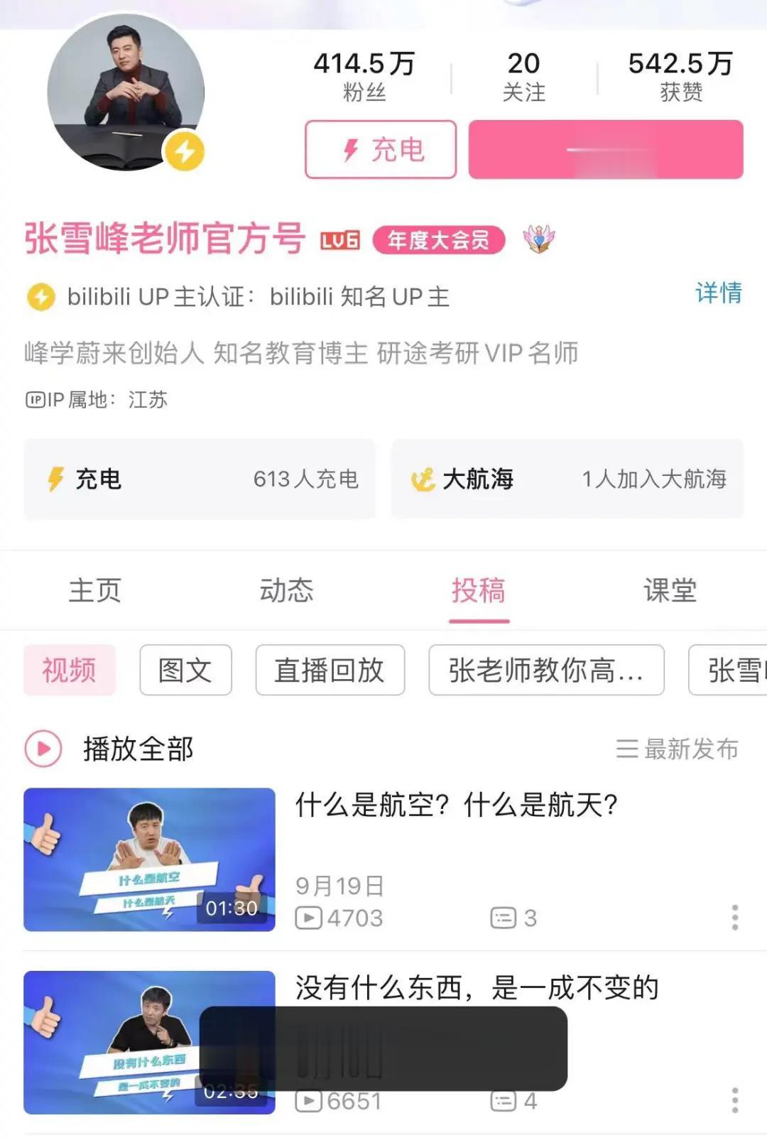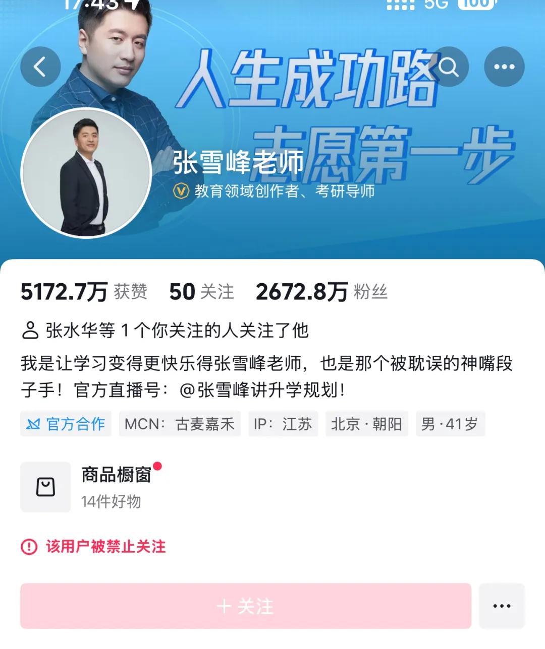 9月24日,高考志愿导师张雪峰的微博、抖音、快手、B站及小红书平台的社交账号出现异常,被禁止关注。这五个平台账号的粉丝合计超过6500万。
