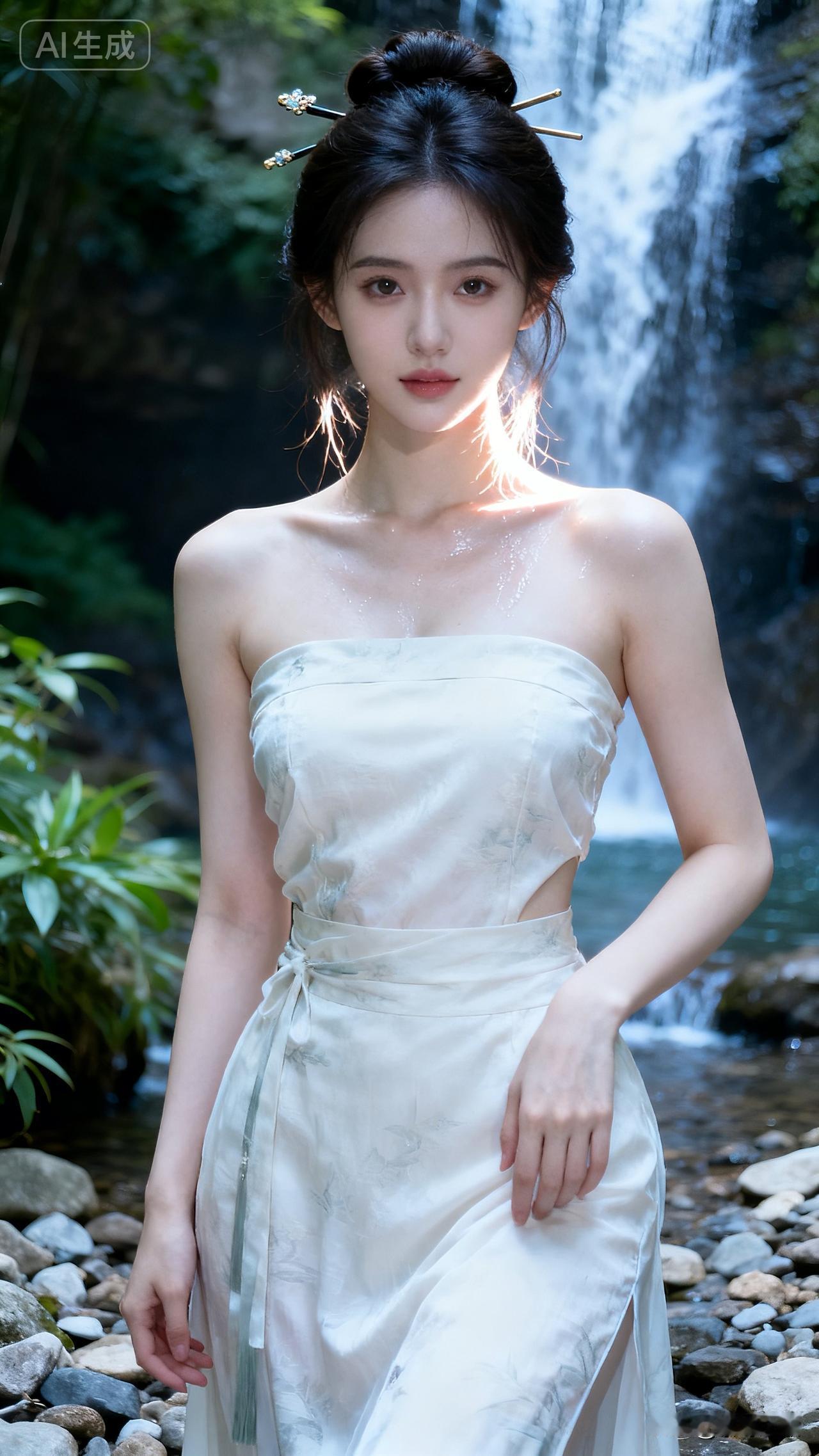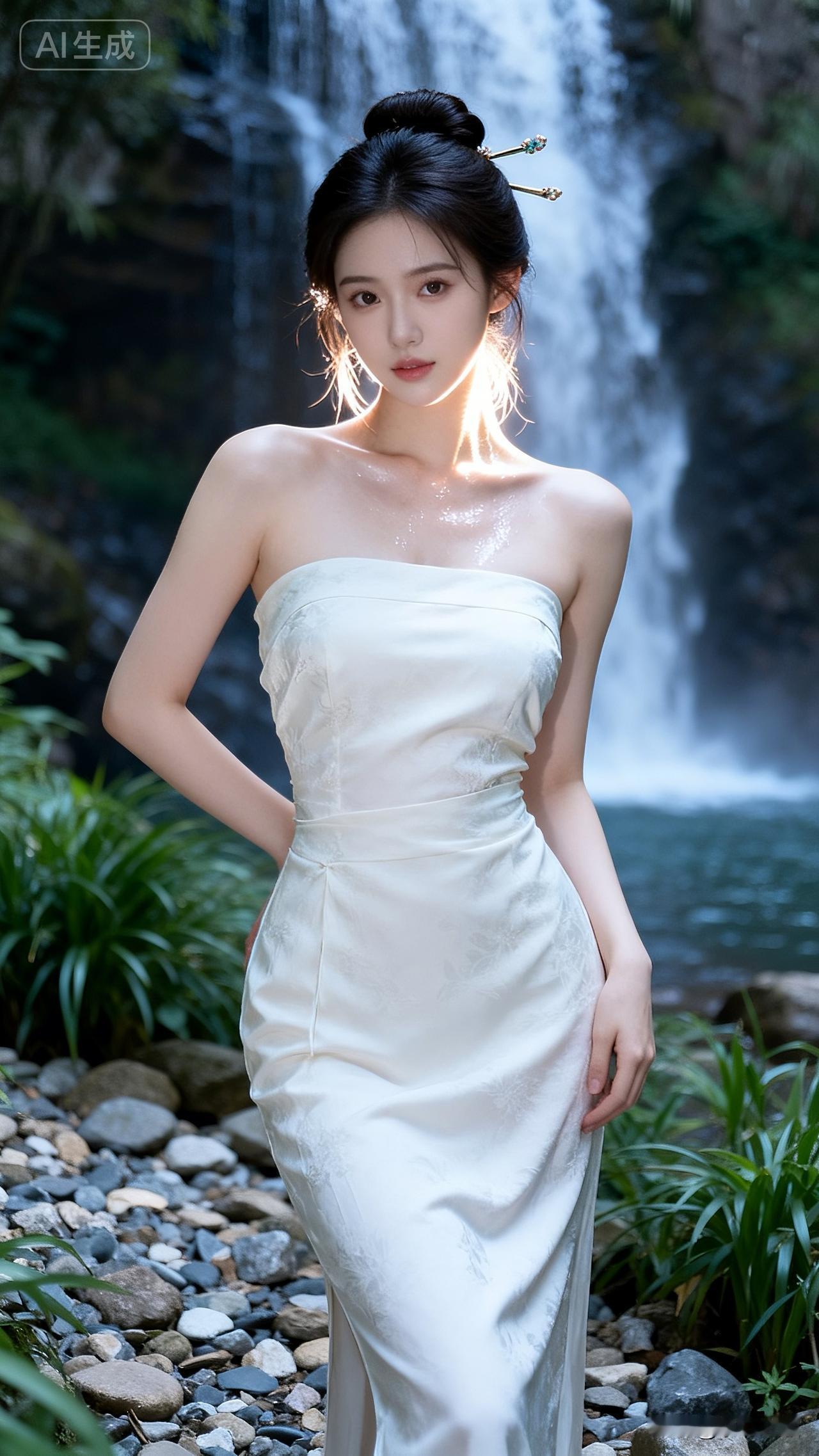 立于山水之间。她有着乌黑的头发,梳成高髻,插着带有装饰的发簪。身着一袭米白色的抹胸裙,裙身带有淡雅的花纹,腰间系着同色系的腰带,裙摆开叉,尽显优雅。她的肌肤在光线映衬下显得细腻,肩头似乎有水滴的效果,增添了一丝灵动。背景是一处瀑布景观,水流潺潺,周围绿植环绕,石块铺就的地面,整体营造出一种清新雅致、仿若世外桃源的氛围。怎样穿搭知性又显身材? 少女风怎么穿