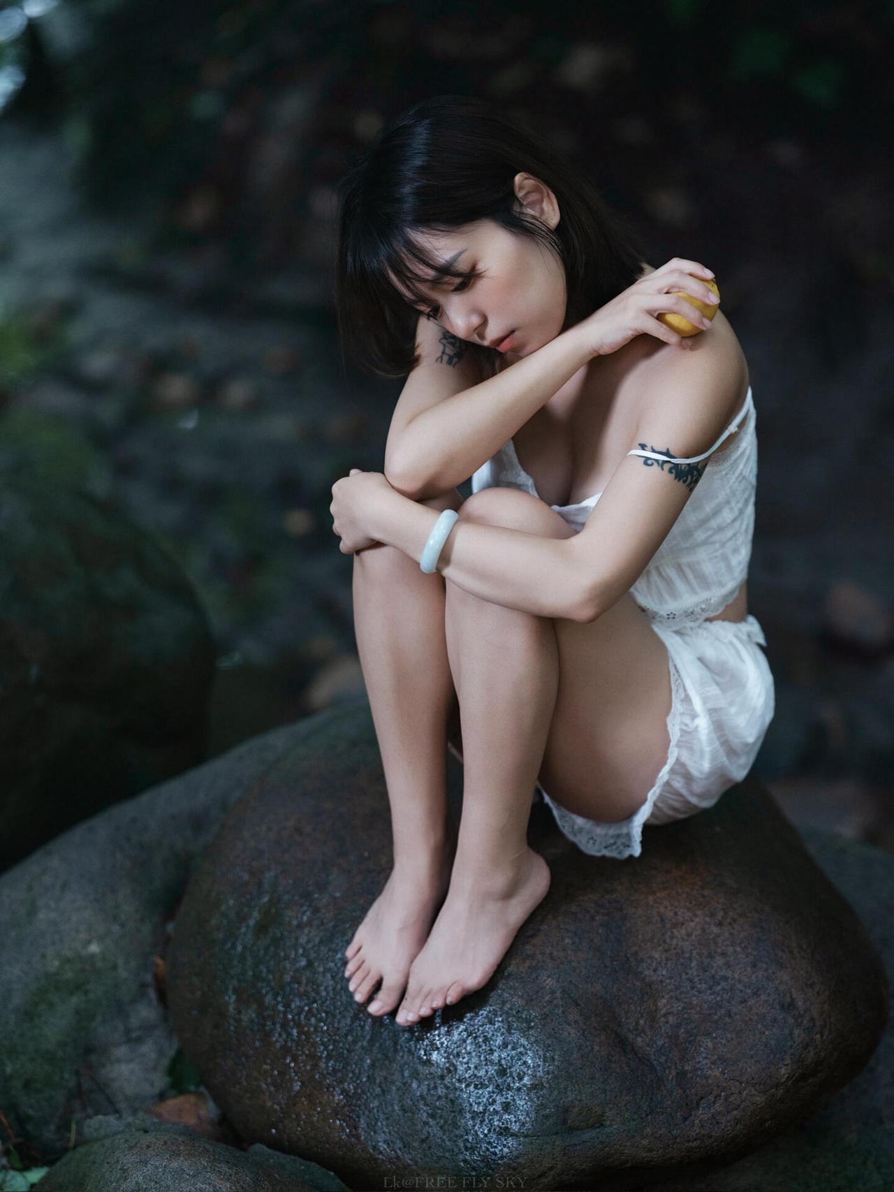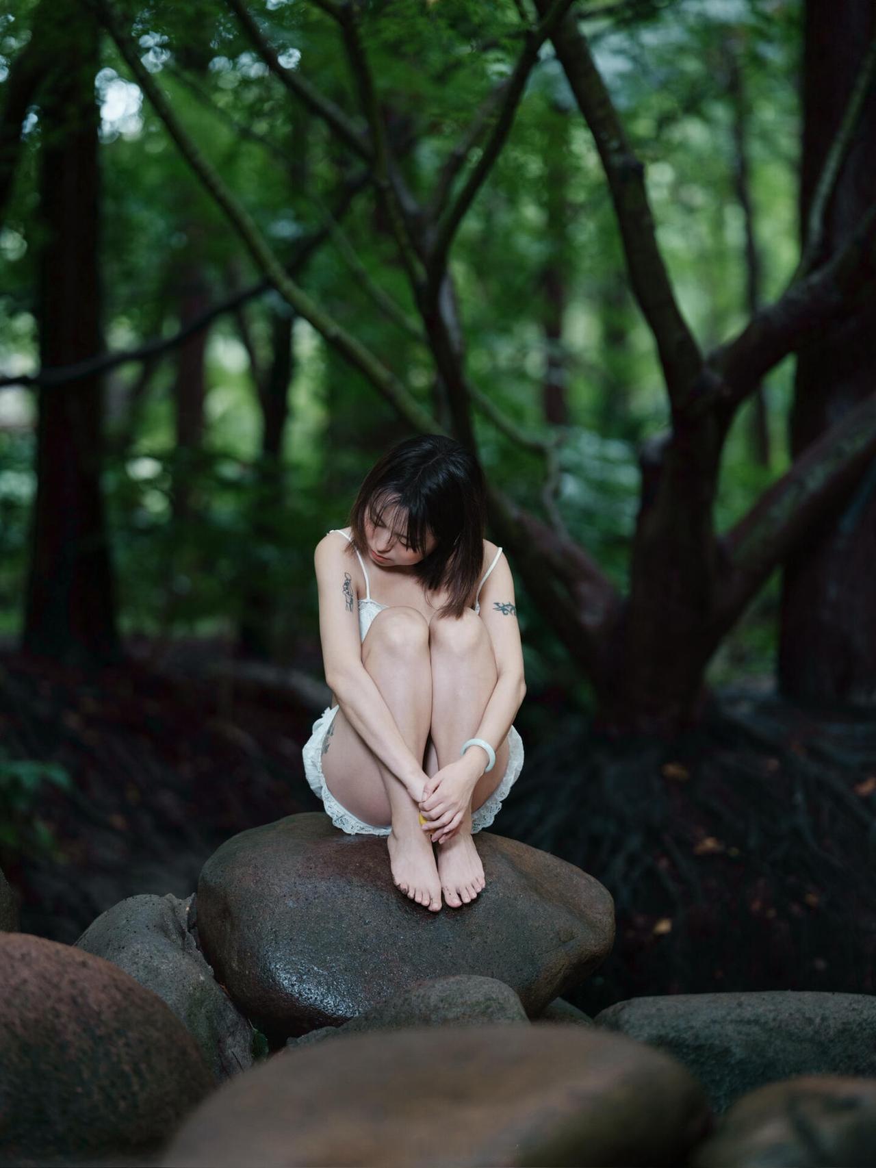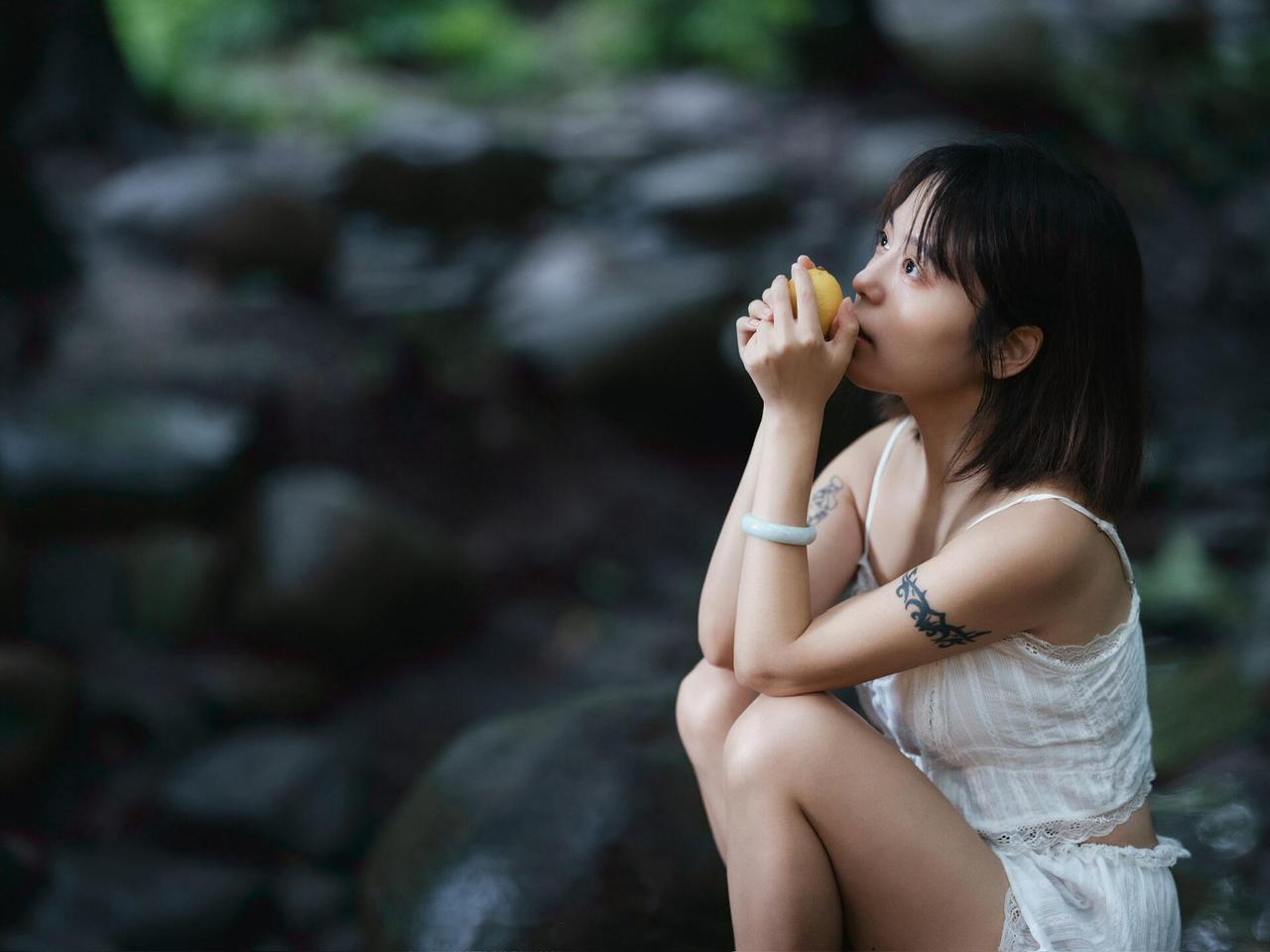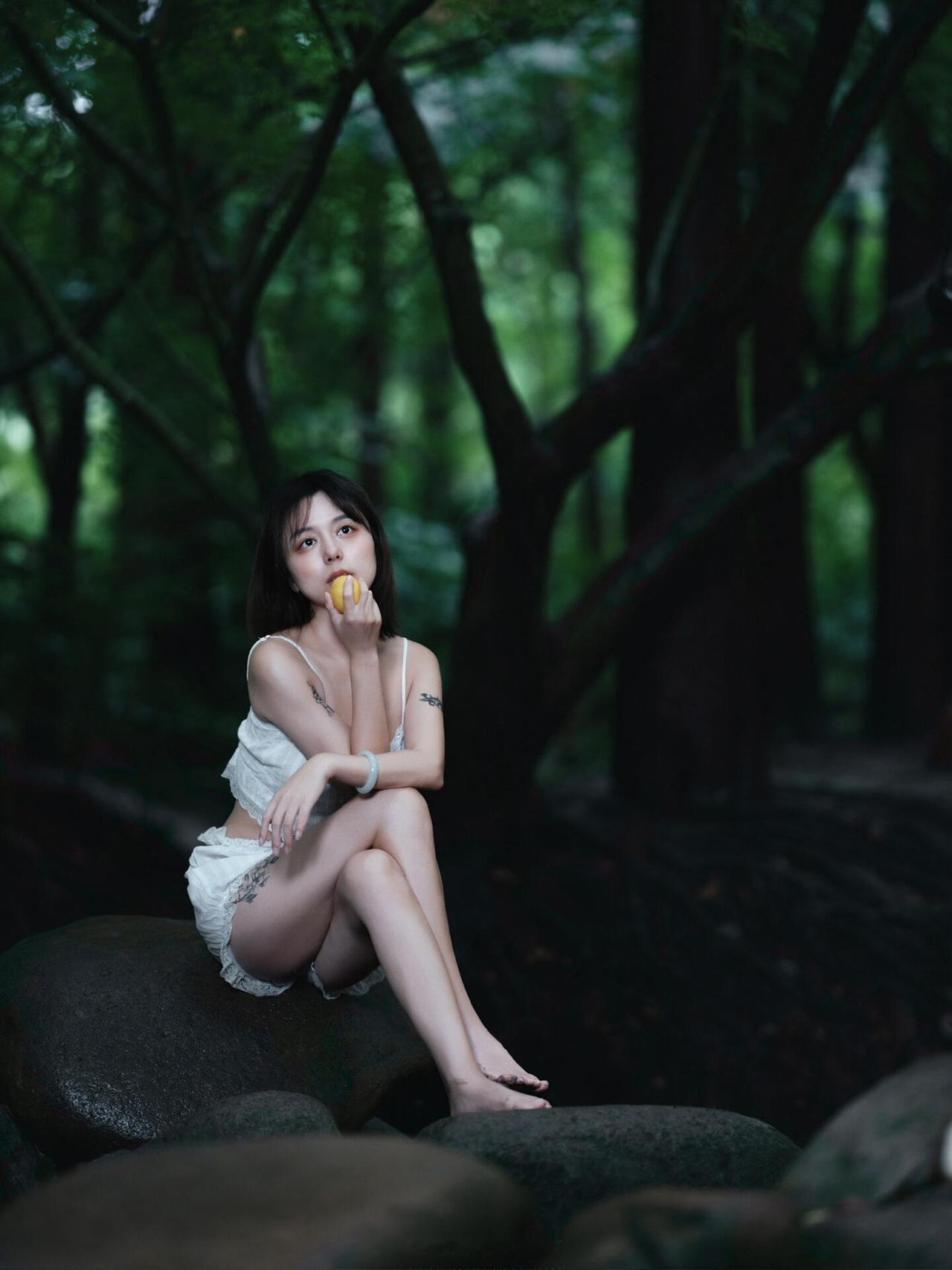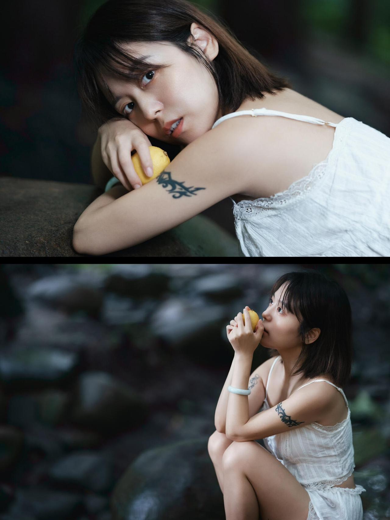 照片把焦点拉得很近,女孩手持柠檬,眼神清亮地看向镜头。白色蕾丝的细节在近景里清晰可见,纹身的图案也更分明,柠檬的明黄在一片深绿中格外跳脱。背景的虚化处理让她成了绝对的主角,却又隐约透着山林的绿意,仿佛她是从这片绿里结出的一枚鲜活果实。 这张照片的妙处在于“色彩的点睛”。柠檬的黄是整个画面的活力源,打破了山林绿的沉闷,也让白色服饰有了焦点。她的妆容清淡,唇色自然,却因柠檬的存在而显得气色极佳,这种“自然妆感”与山林主题格外契合。眼神的表达很直接,没有过多的修饰,像林间小动物般纯粹又充满好奇,这种直白的情绪让照片充满了感染力,仿佛她正拿着这枚柠檬,邀请观者一起品尝山林的鲜活。