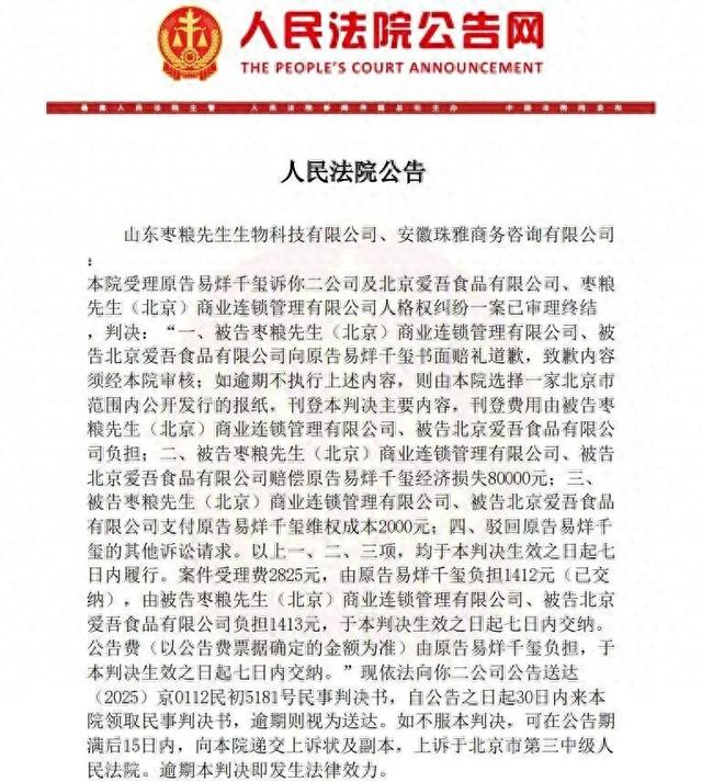 9月30日,记者注意到,据人民法院公告网显示,近日,北京市通州区人民法院向山东枣粮先生生物科技有限公司、安徽珠雅商务咨询有限公司送达原告易烊千玺起诉前述两家公司及北京爱吾食品有限公司、枣粮显示(北京)商业连锁管理有限公司人格权纠纷一案民事判决书。内容显示,法院判决后述两家公司向易烊千玺书面赔礼道歉,赔偿经济损失、维权成本共计8.2万元。