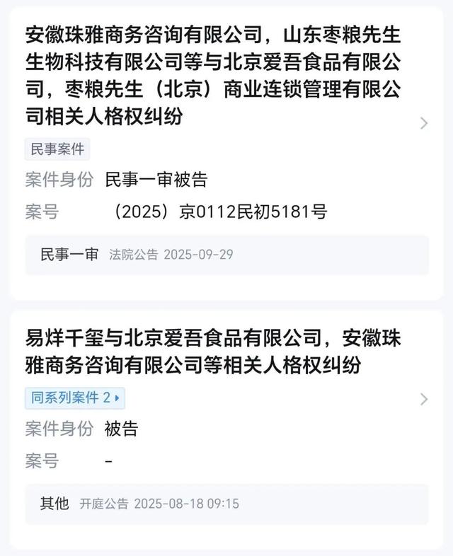 早在6月18日,通州区人民法院向山东枣粮先生生物科技有限公司、安徽珠雅商务咨询有限公司送达传票和起诉书副本等,称该院受理原告易烊千玺诉你二公司及北京爱吾食品有限公司、枣粮先生(北京)商业连锁管理有限公司人格权纠纷一案。原告起诉要求:1、判令四被告立即停止使用、销售并删除一切含有原告肖像及姓名的侵权物料,中止侵权行为;2、判令被告一北京爱吾食品有限公司在涉案经营场所、四被告共同在《人民法院报》向原告公开赔礼道歉;3、判令四被告共同向原告赔偿经济损失共计500000元,维权成本合理开支5000元;4、本案诉讼费用由公告费用由四被告负担。此案于2025年8月18日上午9时15分在通州法院第三审判区第三十二法庭开庭审理此案。