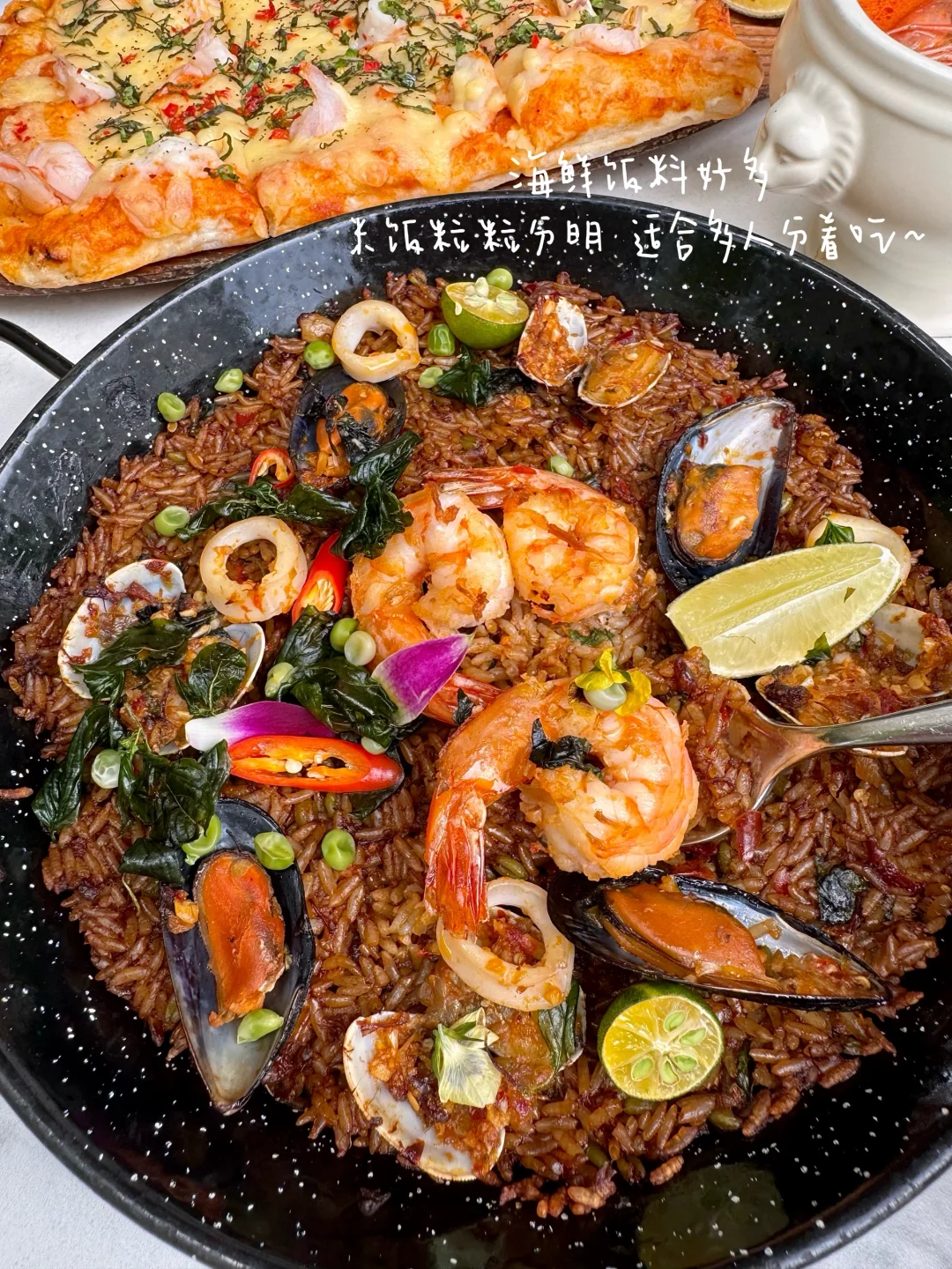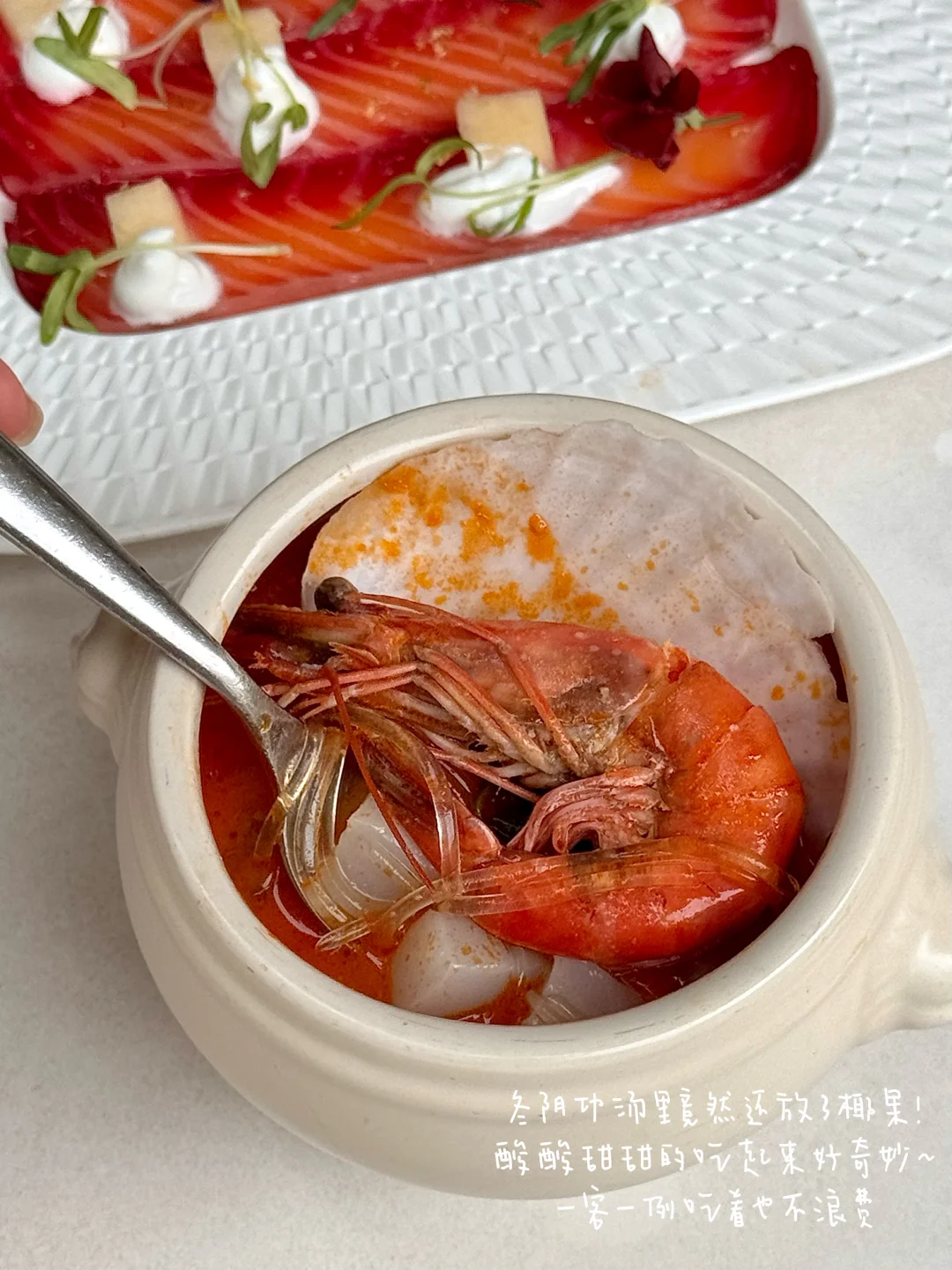 好喝!一人一例的出品精致不浪费~汤头酸甜开胃,里面料很足:大虾、扇贝、粉丝…还有椰果!