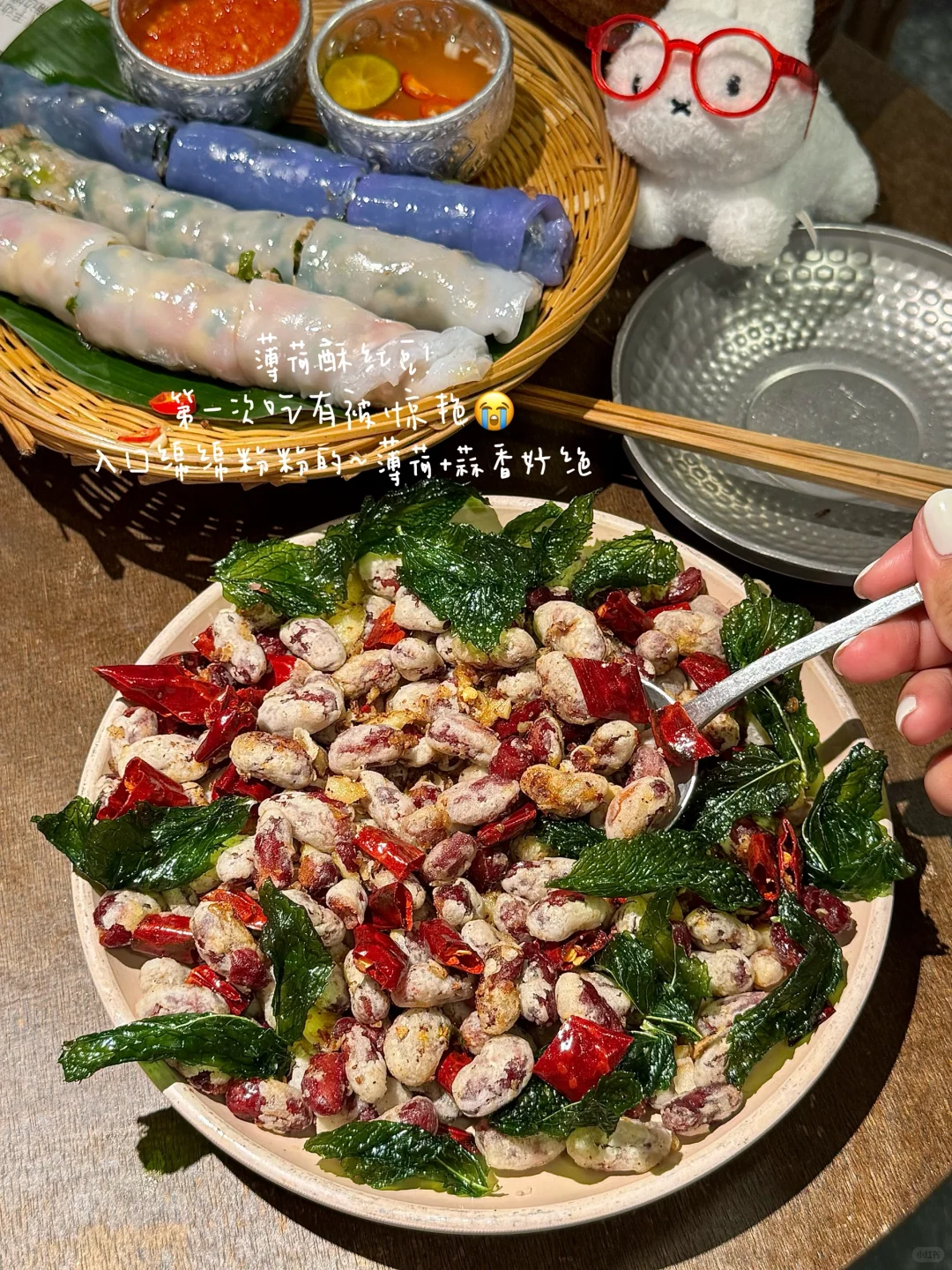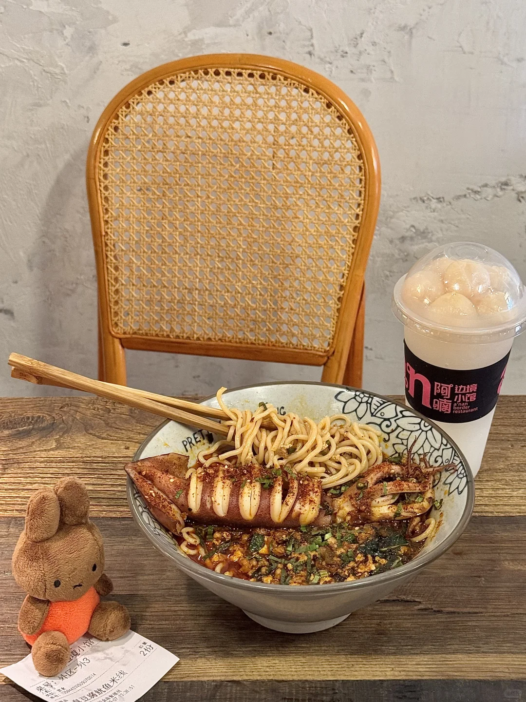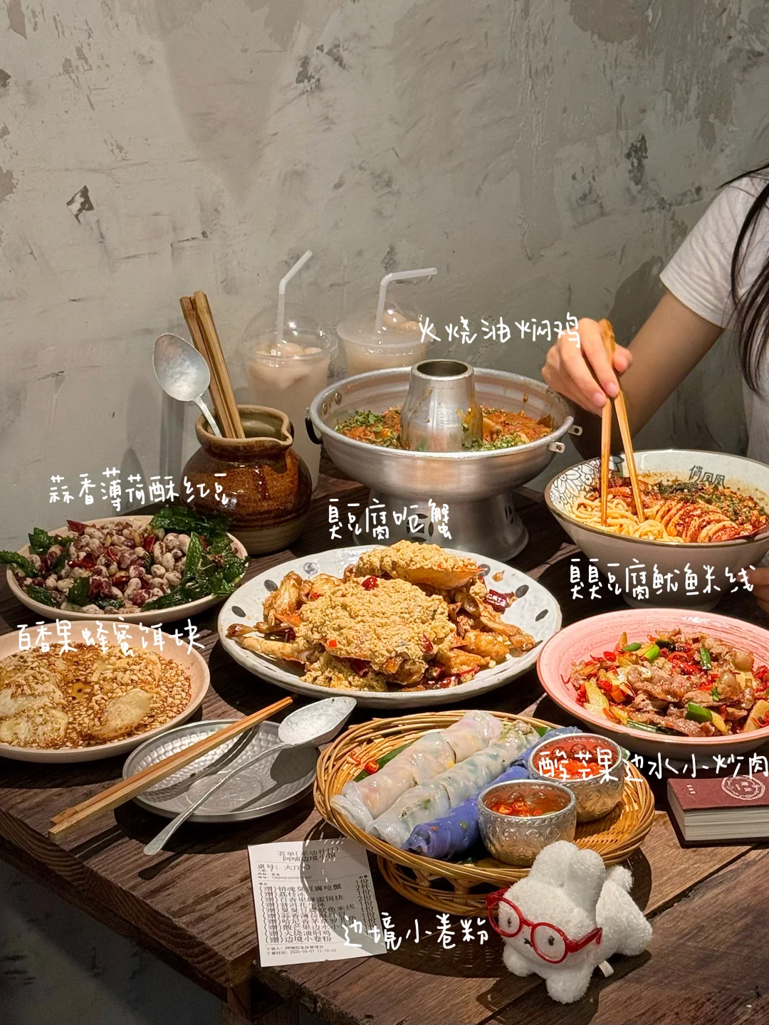 杭州我心中可以排前三的云南菜小馆!!就在滨江天街!!叫(📍阿喃边境小馆),进店仿佛误入清迈…不管是菜品还是环境我都愿意给满分!! 店里真的好有格调!木质的桌椅老式古朴,墙壁的挂画摆件简约街头…随手一拍都好好看,不管是约会还是分手都很合适!! 强推这个臭豆腐鱿鱼米线!一整只大鱿鱼q弹饱满,吃起来好过瘾啊😭还有臭豆腐呛蟹 鲜香入味也好绝!还有普洱花生冰、边境小卷粉、百香果蜂蜜饵块…每一道都好看又好吃!!