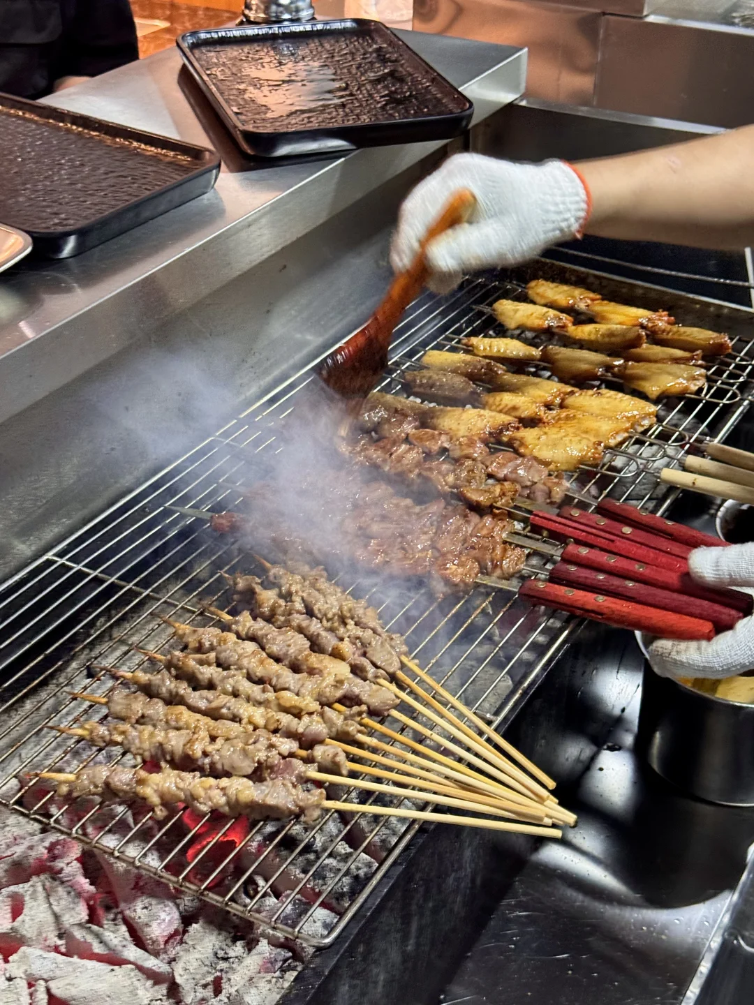 现点现呛的黄喉…油润润好脆啊啊🤤烧烤是很纯正的炭火香!鸡纵菌、黄牛肉、包浆小豆腐、生烤五花肉…空口吃或者搭配四种蘸水都好绝!