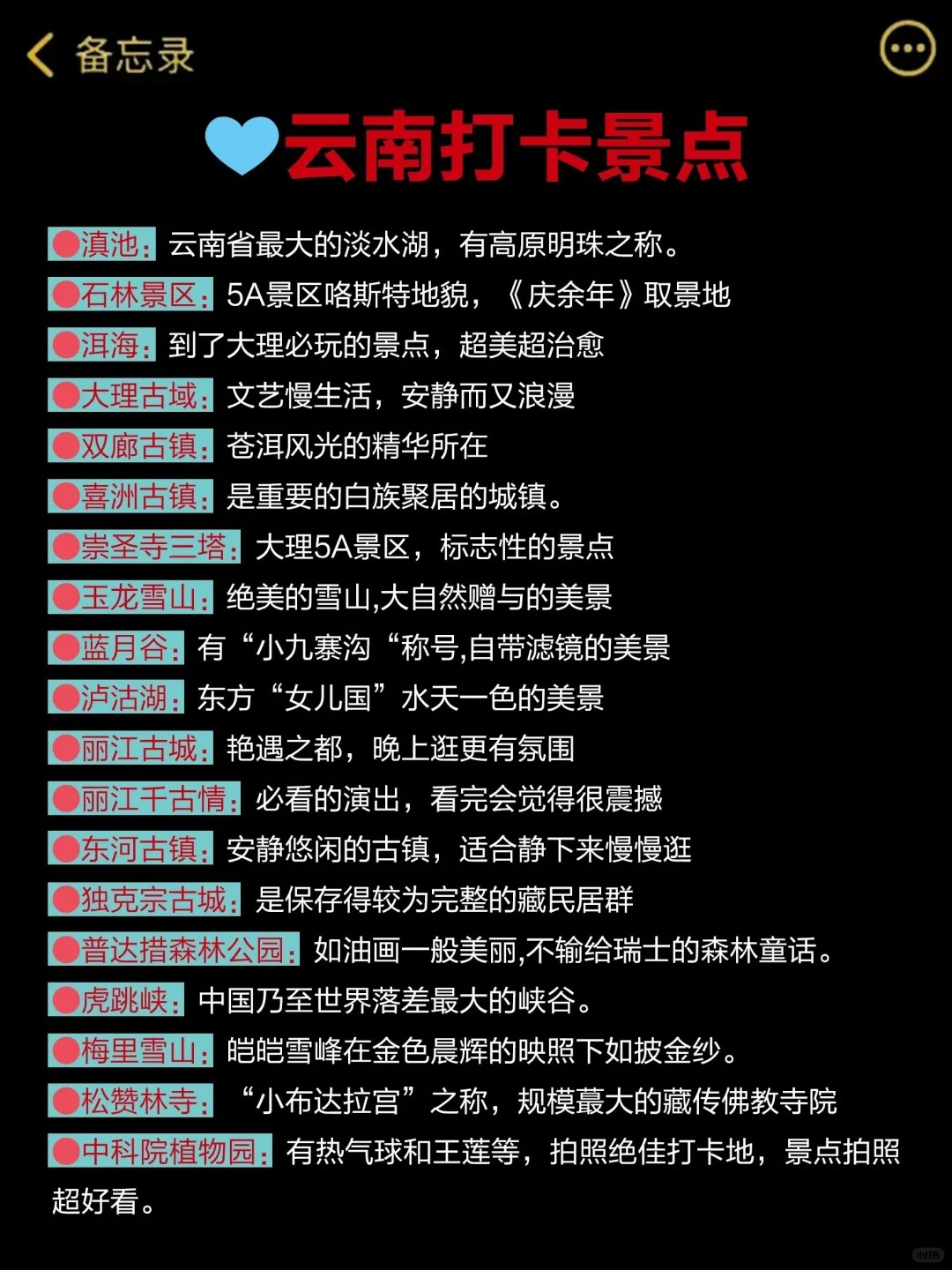 云南真的会惩罚每一个不做攻略就去的人 云南真的会惩罚每一个不做攻略去云南的人,这篇攻略先码住,近期想去云南的都可以参考! . 📮行前提醒📮 1⃣️请注意准备一些个人用的常用药品,以备不时之需 2⃣️云南每天早晚温差较大,到云南旅游应注意着装,预防感冒 3⃣️云南地处云贵高原,室外紫外线照射较强,注意防晒,带好防晒用品; 4⃣️云南气候干燥,记得带好保湿用品做好防护工作 5⃣️云南是一个少数民族聚居的地区,要尊重当地的民族习惯 . ⭕️云南6日游路线 第天:抵达昆明→入住昆明 第天:昆明→石林景区→楚雄野生菌火锅 第天:大理洱海→敞篷吉普车→旅拍→私人游艇→入住大理 第天:大理古城→丽江古城→住丽江 第天:玉龙雪山→冰川大索道→蓝月谷→双廊 第天:昆明→返程回家 . ✅云南美食 ♨️过桥米线:去到云南不吃一碗正宗的过桥米线等于白去一趟呢! ♨️宣威火腿:营养丰富、肉质滋嫩、油而不腻、香味浓郁、咸香回甜 ♨️鲜花饼 提到云南的鲜花饼,大家应该都不陌生,现烤的鲜花饼花香沁心、甜而不腻 ♨️烤乳扇:“乳扇”是云南大理的特色小吃,越嚼越香!去云南游玩,一定要尝一尝乳扇 ♨️喜洲粑粑:云南大理不得不品尝一下当地的喜洲粑粑,是一种色、香、味均佳的麦面烤饼,吃起来口感香酥、内在绵软、油而不腻 ♨️大理砂锅鱼:鱼肉清香细嫩、鲜美爽滑,汤味美鲜香、酸辣可口、百尝不腻。坐洱海旁吃大理砂锅鱼,真的是人间一大享受 ♨️云南手抓饭:傣味小吃是云南名族一大特色,各类食材放在蕉叶下,配着蘸料,相当哇瑟