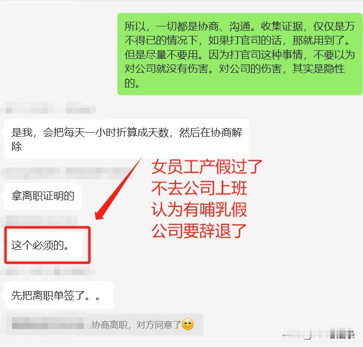 这个是2024年4月11日发生的真实聊天记录,某家公司的一个女员工,过了产假之后,就不去上班,公司认为过了产假,必须回公司上班。女员工的意思,哺乳假期间,小孩子一直哭闹,不好上班。 所以,公司就动了协商解除劳动关系的想法,最终女员工被公司劝退,一分钱补偿金也没有。