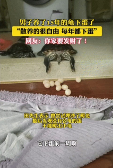 “意外的惊喜!”辽宁大连,一男子去卫生间时,突然发现养了15年的龟倒趴在门槛上,他仔细一看,龟竟然在下蛋,妻子见状,直接蹲在地上拍摄龟下蛋的过程,网友:乌龟生蛋,家里要发大财了! 据半岛晨报7月22日报道,田先生(化名)没什么大爱好,不喜欢猫猫狗狗,觉得太掉毛,他就喜欢养乌龟,所以在家养了好几只乌龟,他每天最大的乐趣就是下班后,观察乌龟的一举一动。谁能想到,这天,养了 15 年的乌龟,会搞出个大动静。 事发当天,早上田先生像往常一样准备去卫生间洗漱,然后去上班,他睡眼惺忪的刚走到卫生间门口,眼角余光瞥见门槛那儿有个熟悉的身影。定睛一瞧,自己养的乌龟,不知道什么时候跑到了卫生间门口,居然以一种倒趴的姿势杵在门槛上。 它这姿势怪得很,田先生心里七上八下的,很疑惑这小乌龟在干嘛?结果他凑近了仔细看,好家伙,小乌龟居然是在下蛋!这只龟,这些年一直是散养状态。家里人由着它自由活动,没给它搞啥特殊的居住地,也没刻意关注过它下蛋的事儿。 田先生就这么悠悠哉哉养了 15 年。小乌龟倒也争气,每年都下蛋,像是和家里人达成了一种奇妙默契,偶尔给生活添点小惊喜。要说这养龟的 15 年,小乌龟和这家人处得跟老朋友似的。 平时在家里晃悠,熟悉每个角落,家人也习惯了它的存在。散养的它,自由惯了,却也通人性,不会乱跑添乱,偶尔还会在家人看电视时,慢悠悠爬过来凑凑热闹 。谁能想到,这一回,它选在卫生间门槛这儿,完成下蛋这么重要的事儿。 田先生发现龟下蛋时,那画面挺有意思。小乌龟老老实实趴在门槛,前爪撑着,后半身使着劲儿,一颗蛋慢慢往外冒。田先生的妻子听到动静,也凑了过来,直接蹲在地上,眼睛亮亮地盯着小乌龟,手上举着手机,记录这难得一见的过程。 她没出声打扰,就这么静静拍着,怕惊扰了正在生产的小乌龟。龟下蛋的过程不算快,每一下使力都能让家人瞅见它的努力。一颗颗蛋落地,带着属于生命延续的奇妙。田先生夫妻俩在一旁,心里满是新奇与感慨。 养了这么久的龟,看着它下蛋,就像见证一个特殊的家庭仪式,既陌生又熟悉。陌生的是,从没这么细致观察过龟下蛋的全过程,熟悉的是,这只龟早已是生活里不可或缺的一部分。 等小乌龟下完蛋,夫妻俩才回过神,把这事儿分享到网上。没想到,一下子就热闹起来。网友们看到龟下蛋的视频,炸开了锅。有人说 “乌龟生蛋,家里要发大财了,这是带着对美好寓意的期盼。” 也有人感慨 “养了 15 年,这缘分太深啦,羡慕这份长久的陪伴。” 对于这件事,大家有什么想说的呢?欢迎在评论区分享。 信息来源:半岛晨报 报道于2025年7月22日