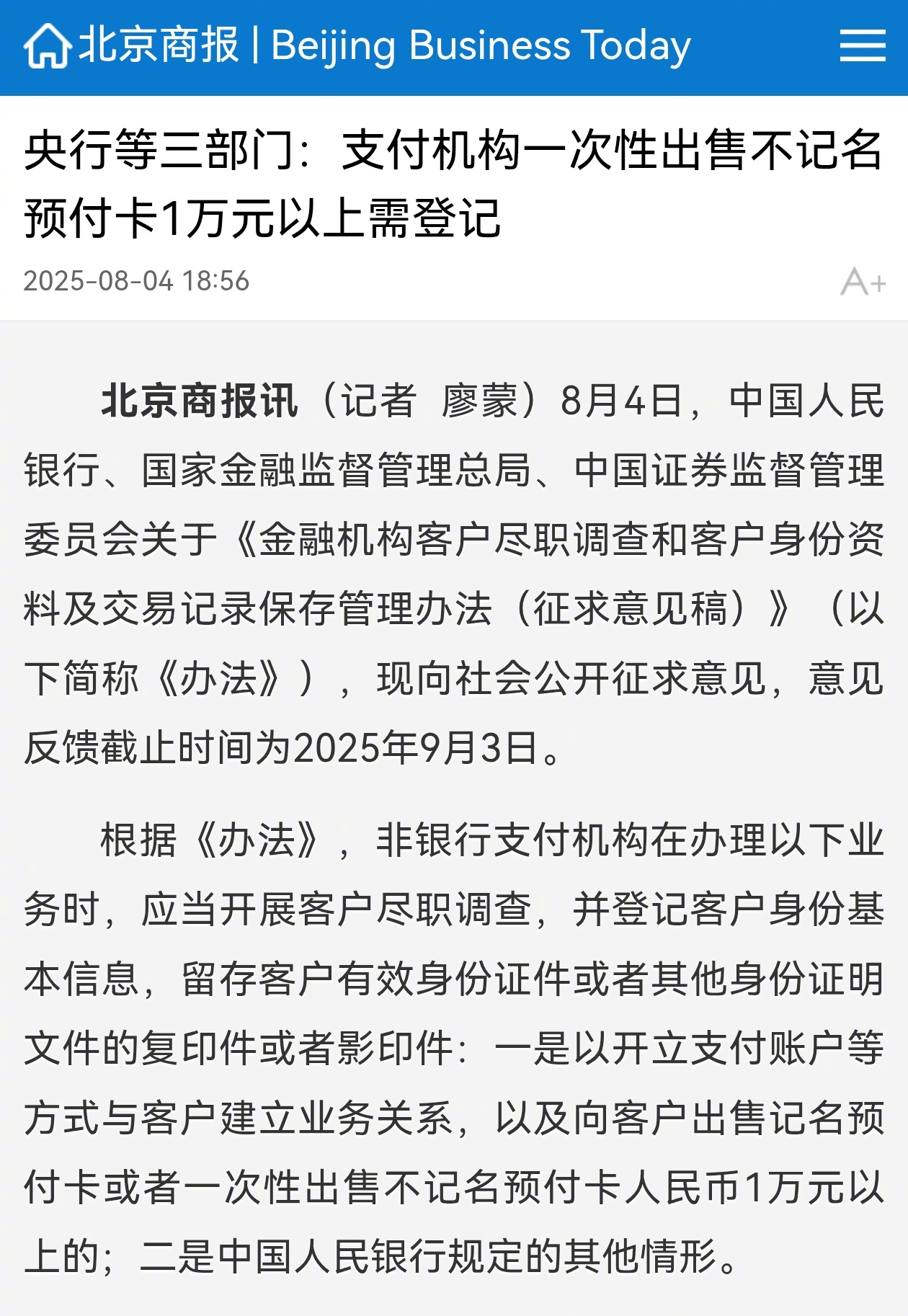 [央行等三部门:#支付机构一次性出售不记名预付卡1万元以上需登记#]8月4日,中国人民银行、国家金融监督管理总局、中国证券监督管理委员会关于《金融机构客户尽职调查和客户身份资料及交易记录保存管理办法(征求意见稿)》(以下简称《办法》),现向社会公开征求意见,意见反馈截止时间为2025年9月3日。