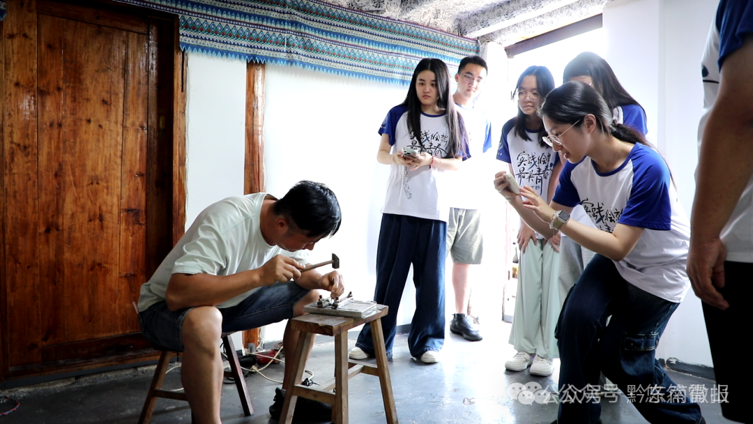 村里的石板路上,一群穿着统一队服的青年格外显眼,他们是北京科技大学酉良银响酉方文化传承实践团的成员,正在银匠师傅龙太阳的带领下,穿梭于各个银饰工坊开展游学活动。从承载历史记忆的古银币文化,到见证民族迁徙的苗族历史,每一个工坊里,银匠师傅们都耐心地将非遗背后的故事与技艺娓娓道来,学生们围坐一旁,听得津津有味,不时拿起银片、工具仔细观察,眼神里满是对这项国家级非遗的好奇与热爱。