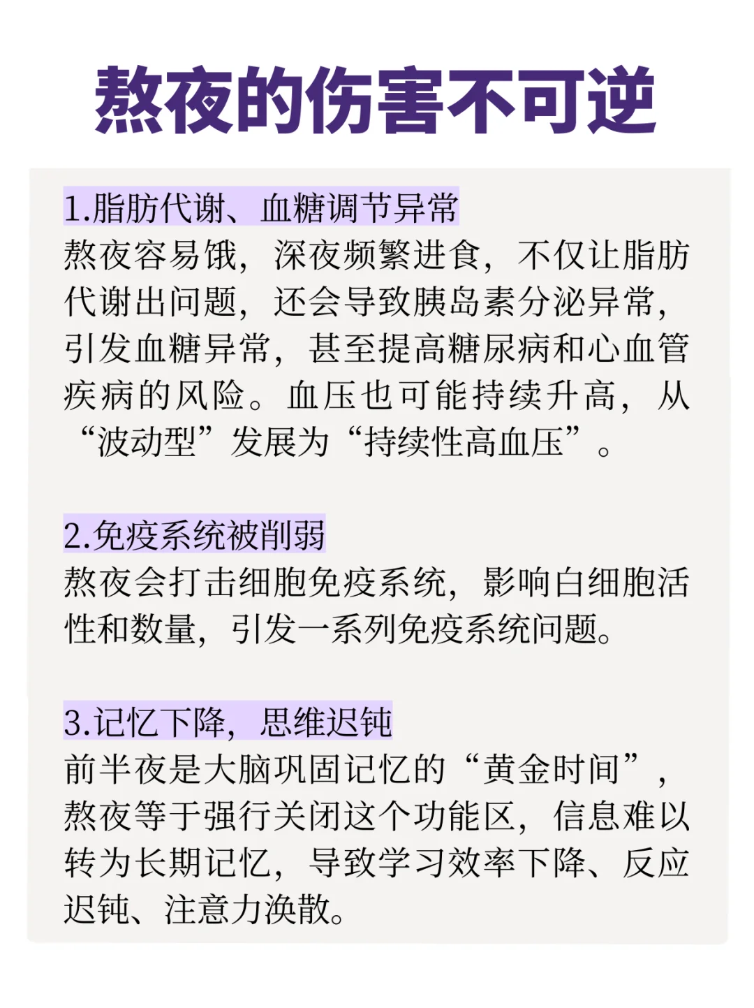 1️⃣ 熬夜的伤害不可逆:脂肪代谢、血糖调节异常;免疫系统受损;记忆能力下降;思维迟钝、注意力不集中。