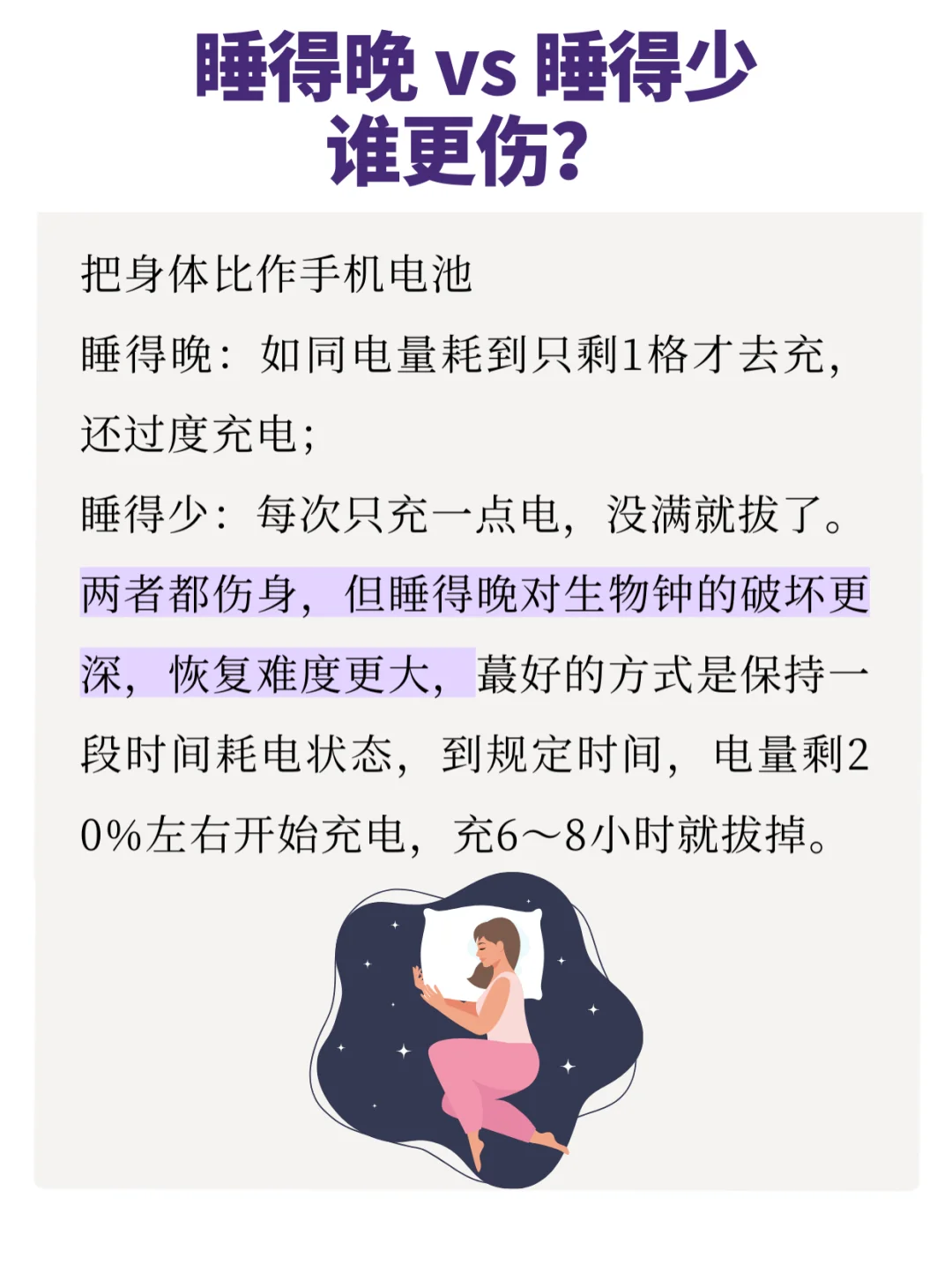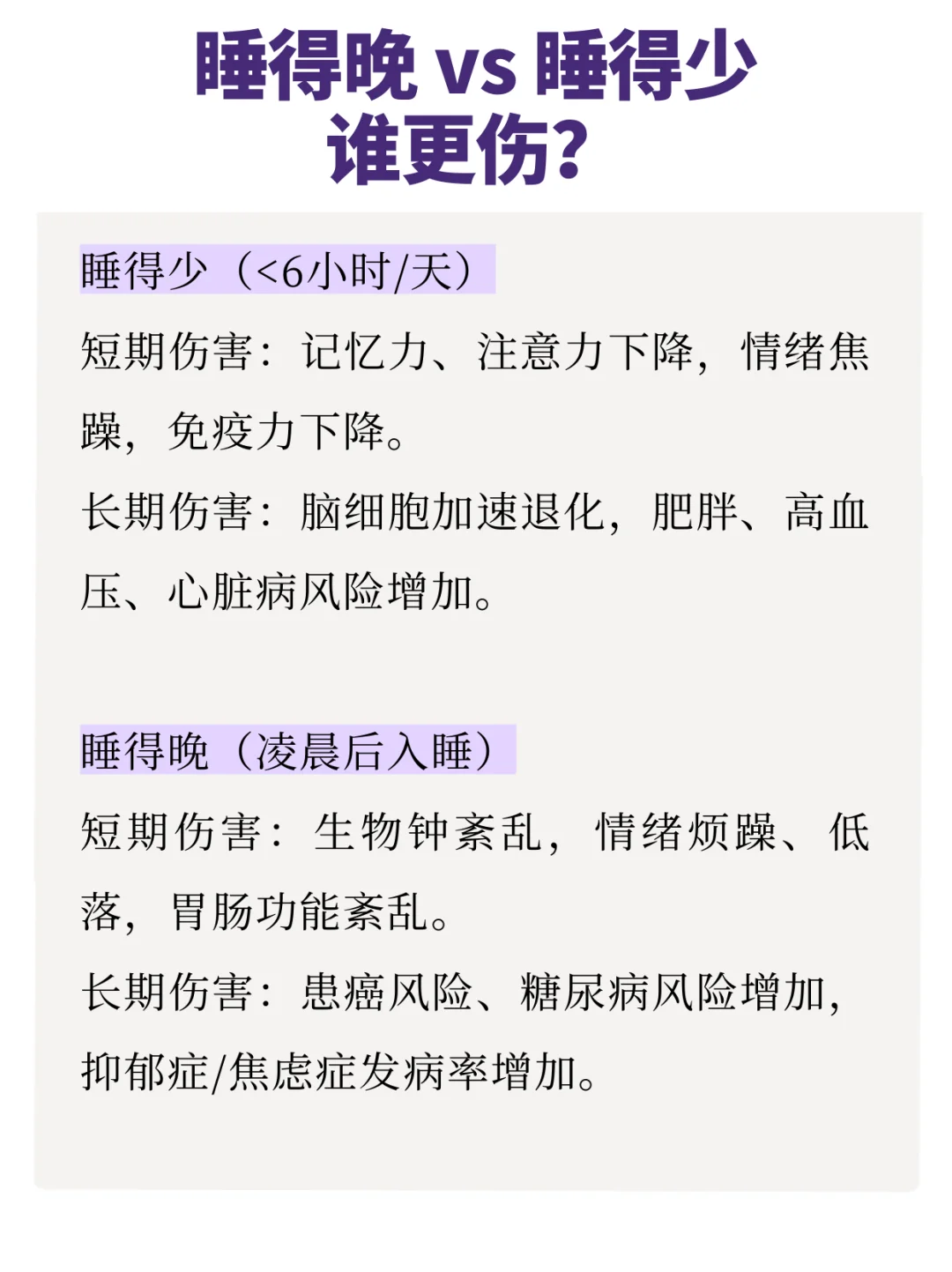 2️⃣ 睡得晚和睡得少,哪个伤害大?这两种方式对身体都有伤害。