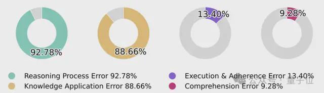 Figure7的饼图揭示了一个关键洞察:92.78%的错误涉及推理过程问题,88.66%涉及知识应用问题,且两者存在大量重叠。