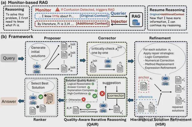 在这个开源底座上,研究团队通过叠加Monitor-basedRAG(隐式知识增强)、HSR(分层解法修复)、QAIR(质量感知迭代推理)三大创新机制,实现了质的飞跃。
