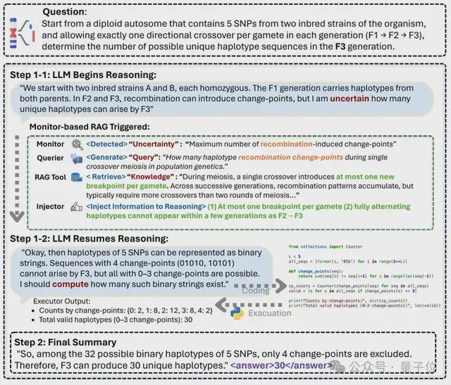 见下图单倍型计数案例,Monitor检测到重组约束的不确定性,Querier生成针对性查询,Injector注入两个关键事实,使模型能够排除无效案例并得出正确的30个单倍型答案。