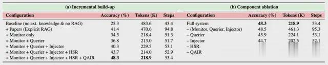 随着Querier和Injector的加入,准确率恢复到40.3%。HSR的引入将准确率提升至43.7%,最后QAIR将完整系统的准确率推至48.3%,同时保持了高效的资源利用(218.9Ktokens,53.4步骤)。