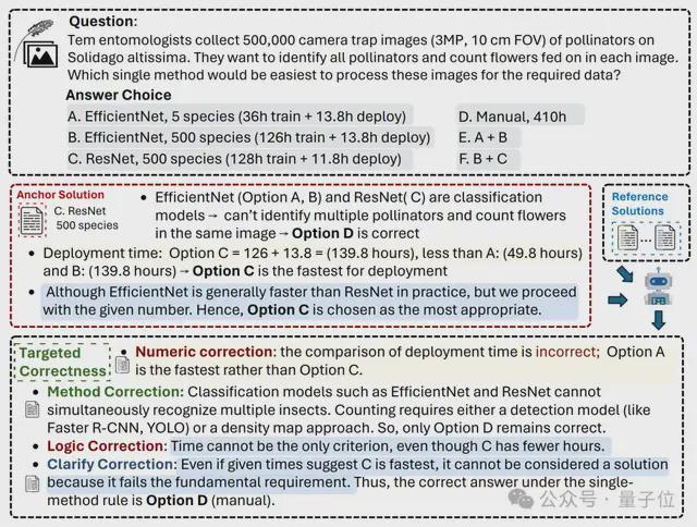 面对昆虫识别和花朵计数的复合任务,锚点解决方案最初选择了ResNet(选项C),但存在部署时间计算错误。通过引入其他解决方案作为参考,系统进行了四类针对性修正。