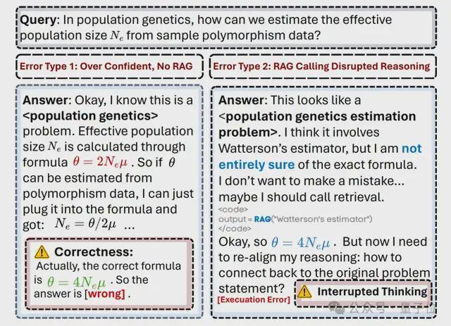传统RAG系统的“工具税”问题在下图的人口遗传学案例中展现得淋漓尽致。左侧显示模型过度自信地使用错误公式,右侧则展示了即使通过显式RAG获得正确公式,推理流程的中断导致模型无法将知识重新整合到原始问题中。