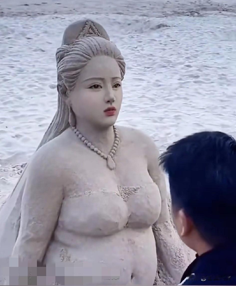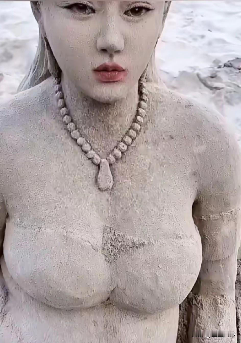 感觉像真人摸了沙子上去,从肚子可以看出来怀了好几个月了吧?看眼睛就是真人 不用考虑了,绝对是真人。雕塑的话不会搞那么大的肚子,影响美观。真人涂了层沙嘴唇还红的,应该就是真人,有本事挖掉一块再补回去。光线照射下,肚子阴影分布符合真人身体结构。珍珠项链和发髻真不好雕啊!
